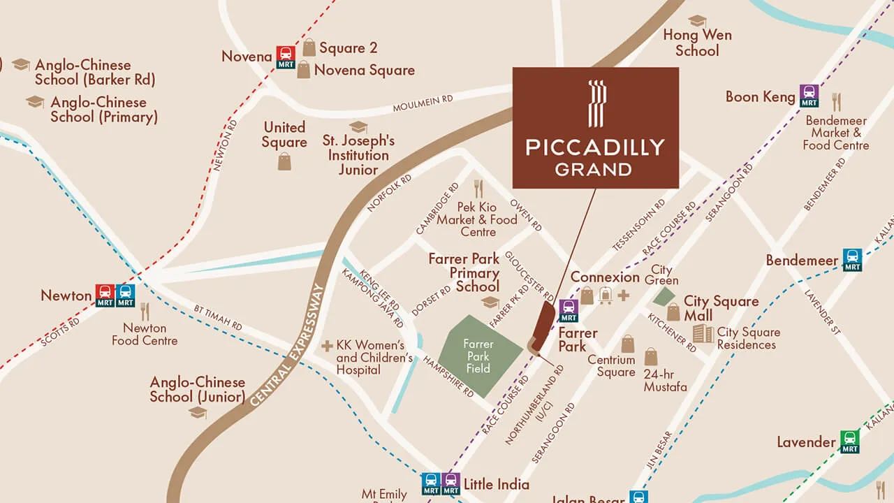 Piccadilly Grand 直接连 Farrer Park 地铁站(NE8),基本可以把它当成住在地铁口楼上,从这里出发去市区的学校,多数公共交通 10–25 分钟能到,打车 10–15 分钟内。